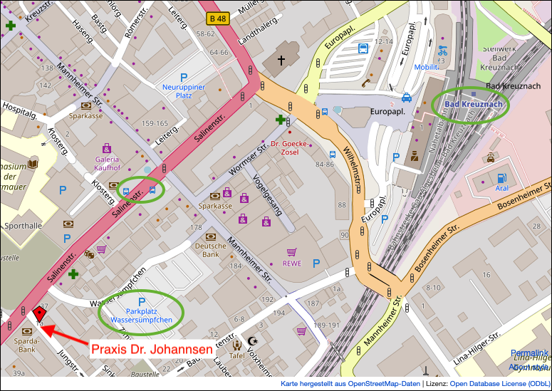 Vom Bahnhof Bad Kreuznach sind es ca. 600 Meter zu Fuß in die Praxis.
